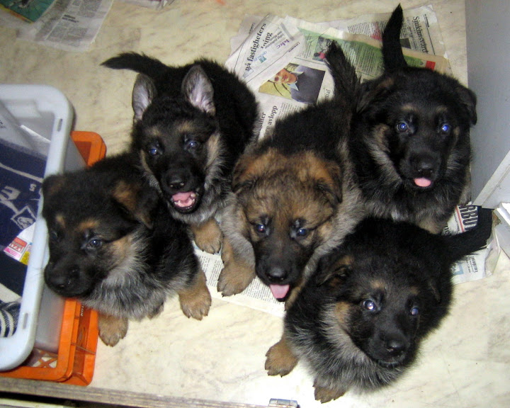 Kokonaisuutenaan pentue on luonteiltaan melko tasainen, vaikka onhan jokaisella pennulla oma persoonallisuutensa. Pennut ovat reippaita, avoimia, rohkeita ja sellaisia riiviöitä, kun nyt koiranpentujen pitääkin olla. Tässä vaiheessa pennut alkavat jo pikkuhiljaa uskoa, että ihmiset eivät ole puruleluja (paitsi aamuisin, jolloin kaikki liikkuva on naskalien kohteena), huonekalujen kanssa on vielä vähän tekemistä. Leluilla nämä kakarat leikkivät tosi mielellään ja kiinnostuksen herättäminen on helppoa, eli saalistavat palloja, rättejä sun muuta, mihin nyt keksimmekin niiden taistelutahtoa suunnata (jalkojen, käsien, kenkien sijaan). Ahneuden ovat perineet äidiltään täysmääräisenä (Alli on ahnein tuntemani koira) ja ruuan tarjoileminen siististi onkin tällä hetkellä melkoinen taitolaji.